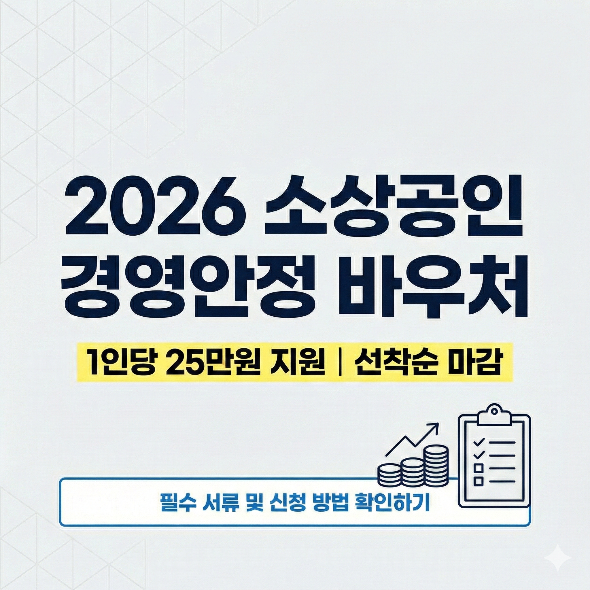 정부에서 발표한 2026 소상공인 경영안정 바우처는 요건만 맞으면 사장님 1인당 25만 원을 현금처럼 쓸 수 있는 포인트로 지원해 드립니다. 중기부 공고 제2026-37호에 기반한 최신 정보를 상세히 정리해 드립니다.